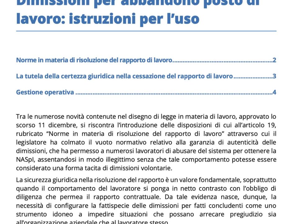 18 Dicembre 2024Pubblicato da Simone Cagliano il 18 Dicembre 2024Dimissioni per abbandono del posto di lavoro: Istruzioni per l’uso